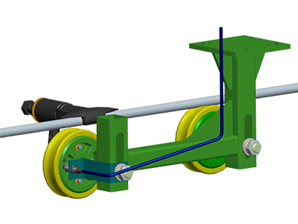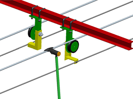 在托輪的下方全線路上設置一根鋼絲繩,當吊椅發(fā)生過擺時,防過擺的鋼絲繩將吊椅擋回去,使吊椅恢復正常位置。