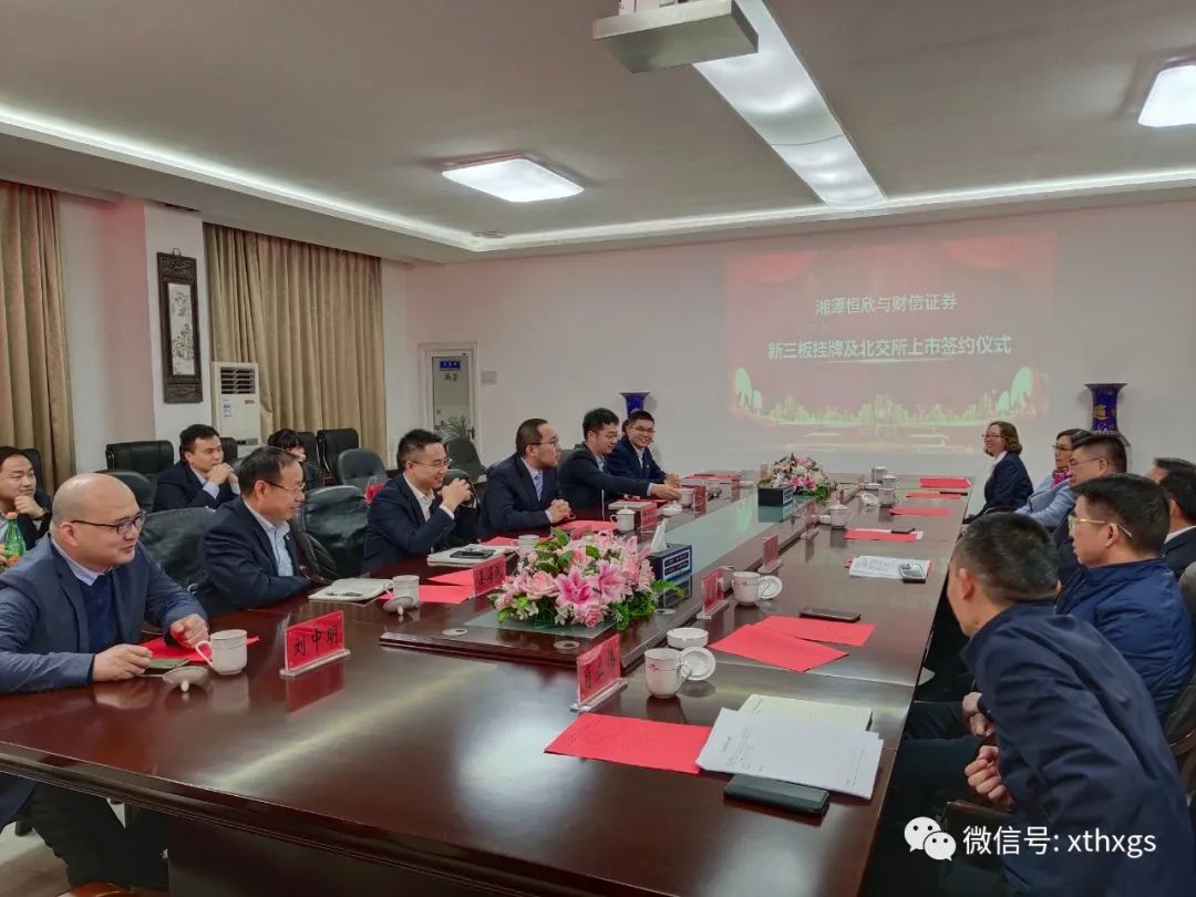 參觀后進入會議室觀看企業(yè)宣傳片,肖董事長向龍海彧副總裁一行的到來表示歡迎并簡要介紹公司的情況和發(fā)展規(guī)劃。隨后龍海彧副總裁和李云祥副首席代表分別進行了致辭,韶山市副市長易繼輝發(fā)表了講話。并在大家的見證下,【湘潭恒欣】肖公平和財信證券副總裁龍海彧簽訂了新三板掛牌及北交所上市協(xié)議。