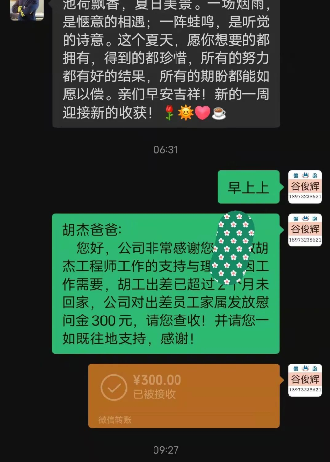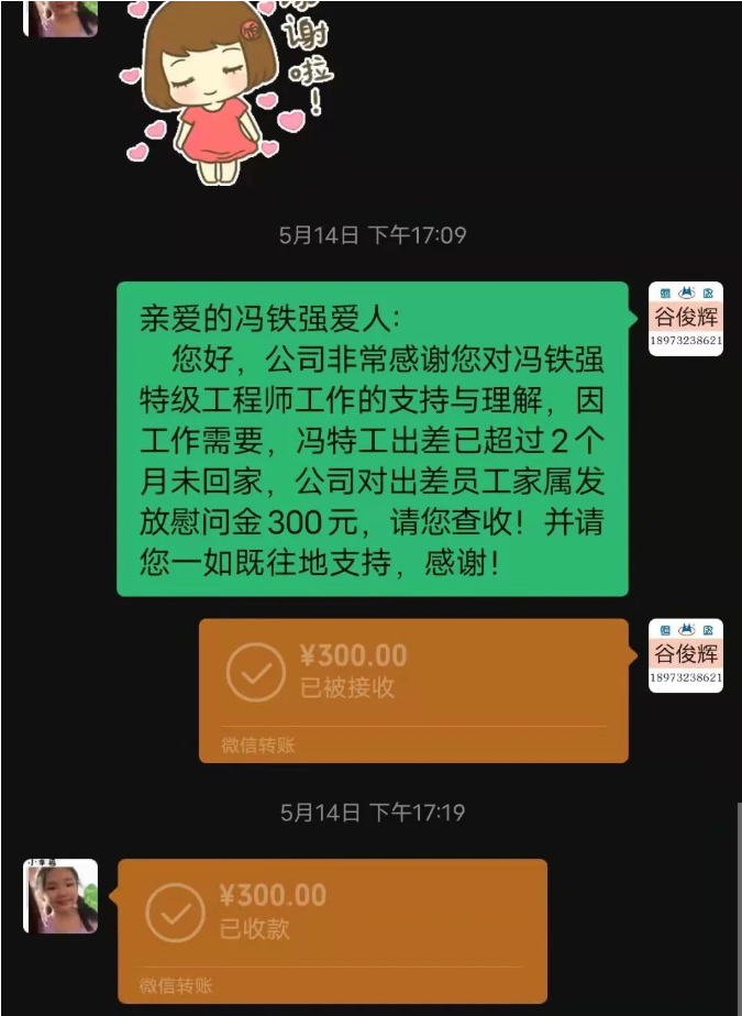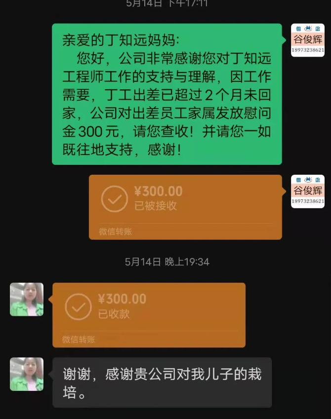 【湘潭恒欣】為了感謝售后服務(wù)工程師們的家屬對其工作的支持,及長期出差不能照顧家庭的理解,除在重要日子對其家屬們送去祝福和問候外,還會對出差超過2個月以上的售后服務(wù)工程師們的家屬發(fā)放慰問金。