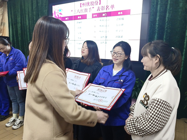 首先由【恒欣股份】婦聯(lián)主席胡丹宣布了關(guān)于表彰【恒欣股份】三八紅旗手的決定以及獲獎(jiǎng)名單。隨后工會(huì)主席李繼偉向“三八紅旗手”們給予了肯定,也提出的期望。最后總經(jīng)理肖薇向“三八紅旗手”們表示感謝,感謝她們?yōu)椤竞阈拦煞荨康陌l(fā)展而辛勤的工作,也感謝她們背后的家人們的理解和支持。在大家的見證下,總經(jīng)理肖薇為11名“三八紅旗手”頒發(fā)了榮譽(yù)證書和獎(jiǎng)金。