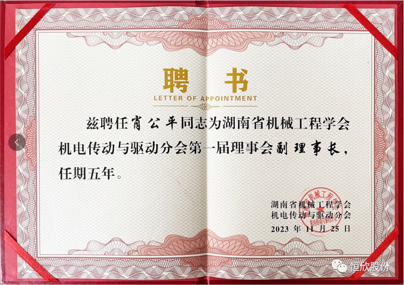 在本次會議中,【恒欣股份】董事長肖公平當(dāng)選湖南省機(jī)械工程學(xué)會機(jī)電傳動與驅(qū)動分會第一屆理事會副理事長,這是對我司長期堅持技術(shù)創(chuàng)新的有力詮釋,也將進(jìn)一步推動【恒欣股份】自主創(chuàng)新、自主研發(fā)的動力,為礦山提供更智能、更高效、更安全的機(jī)械裝備。肖董事長表示將認(rèn)真履行好分會副理事長職責(zé),與分會同仁攜手奮進(jìn),不遺余力地為分會工作開展貢獻(xiàn)力量。