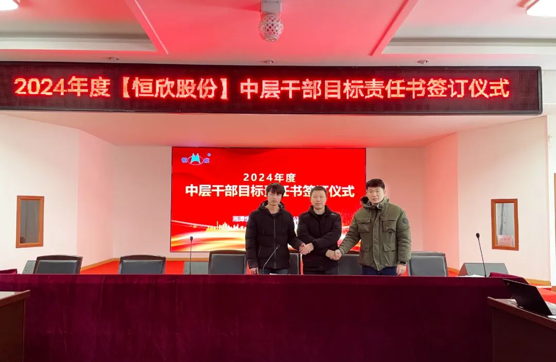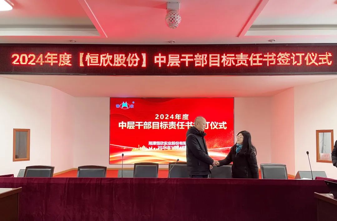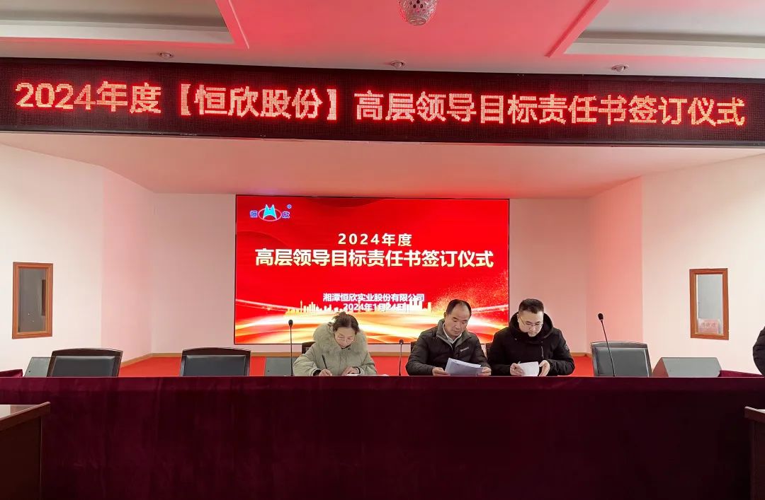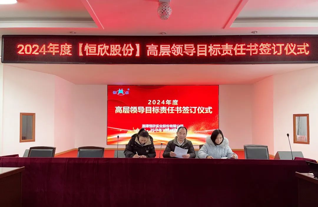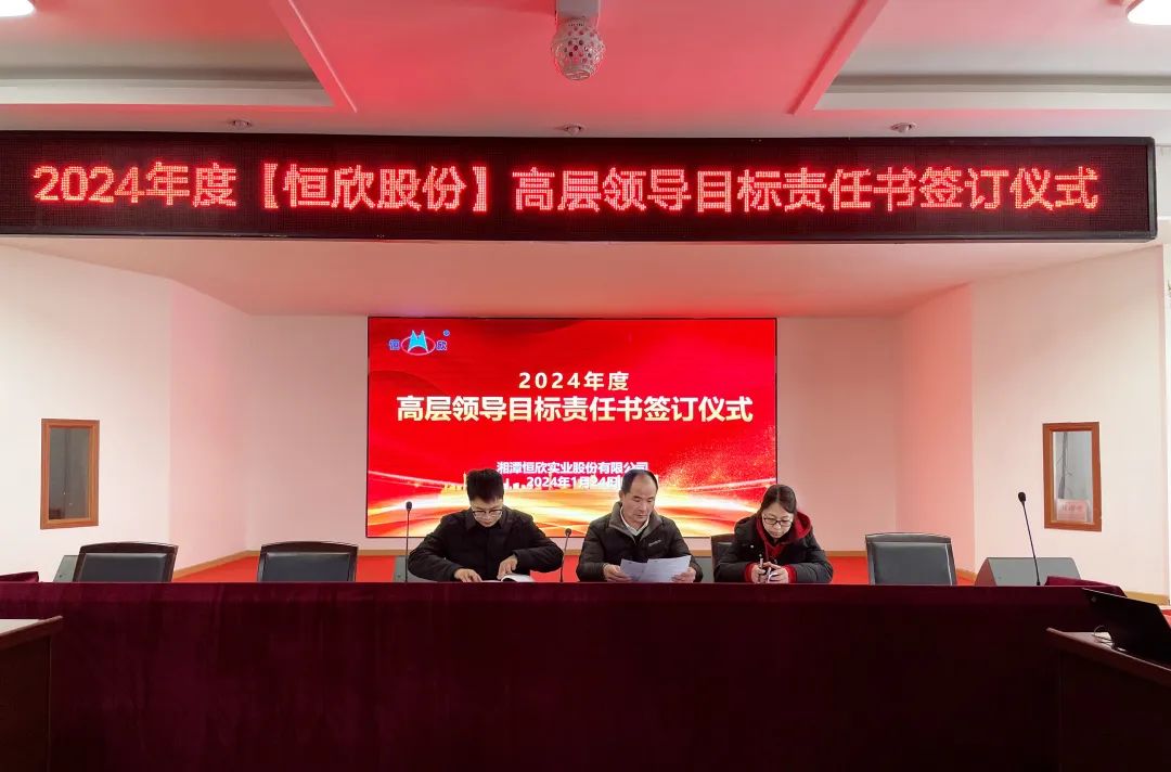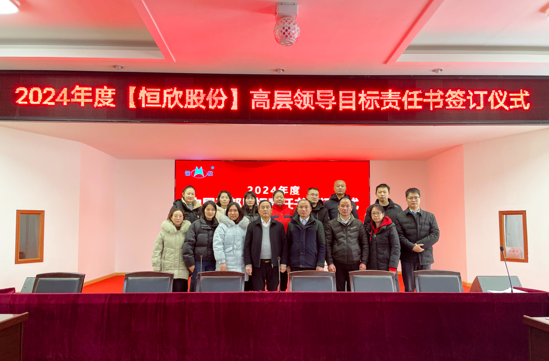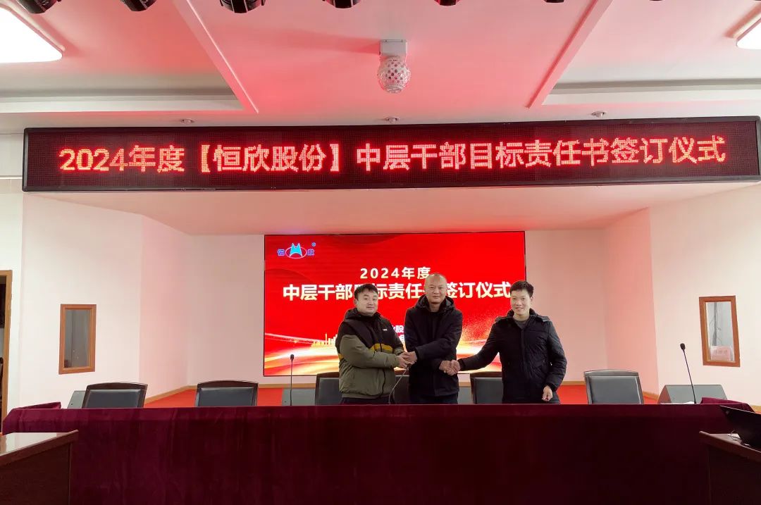 鳴鼓掛帥錨目標,滿弓勁發(fā)啟新程!1月24日下午,【恒欣股份】舉行2024年度目標責任書簽訂儀式。儀式由董事長肖公平主持,副董事長肖連平、總經理肖龍武和全體高層領導、中層干部參加了簽訂儀式。