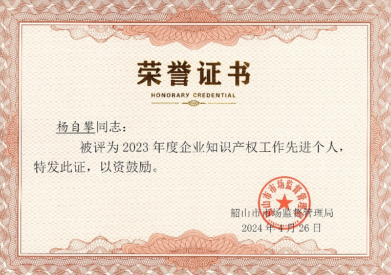4月26日,韶山市委宣傳部和韶山市市場監(jiān)督管理局等單位聯(lián)合主辦了韶山市2024年“知識產(chǎn)權(quán)宣傳周”主題活動(dòng)。活動(dòng)現(xiàn)場上,由韶山市委常委、副市長鄒正光為榮獲知識產(chǎn)權(quán)榮譽(yù)的企業(yè)和個(gè)人進(jìn)行頒獎(jiǎng)和授牌。董事長肖公平接受鄒副市長為【恒欣股份】獲評國家知識產(chǎn)權(quán)示范企業(yè)的授牌,【恒欣股份】知識產(chǎn)權(quán)辦主任楊自攀被評為企業(yè)知識產(chǎn)權(quán)工作先進(jìn)個(gè)人。