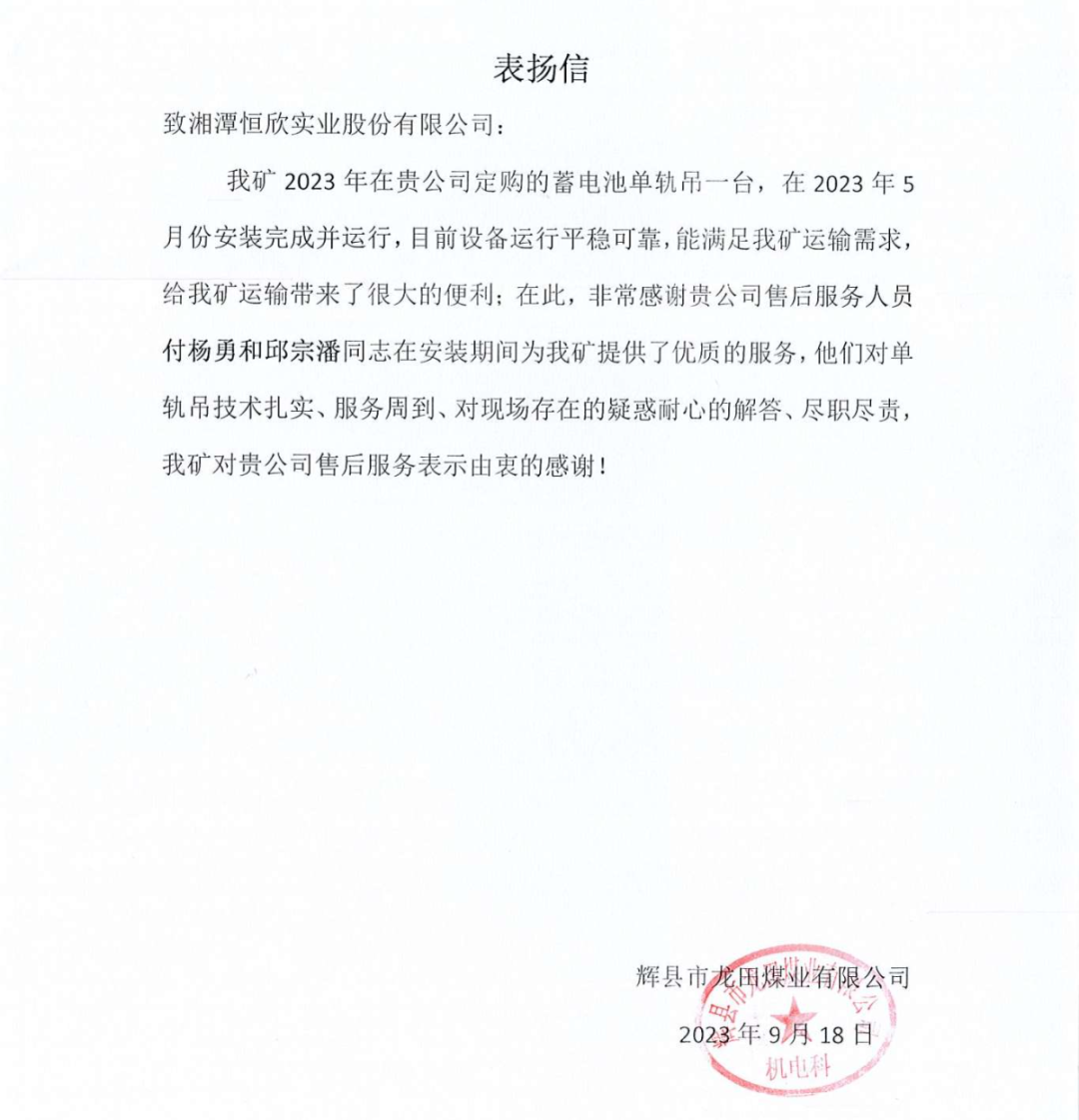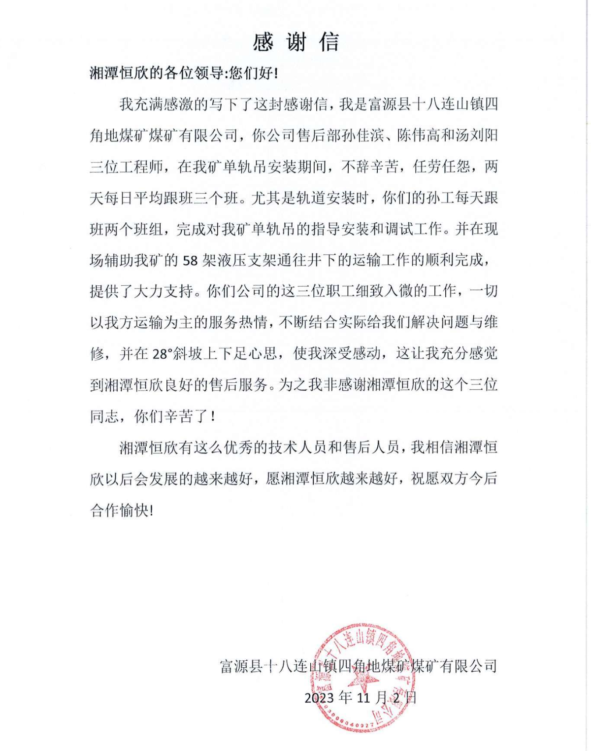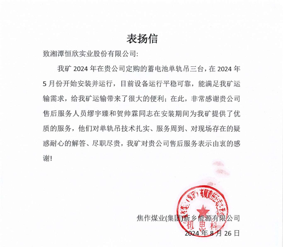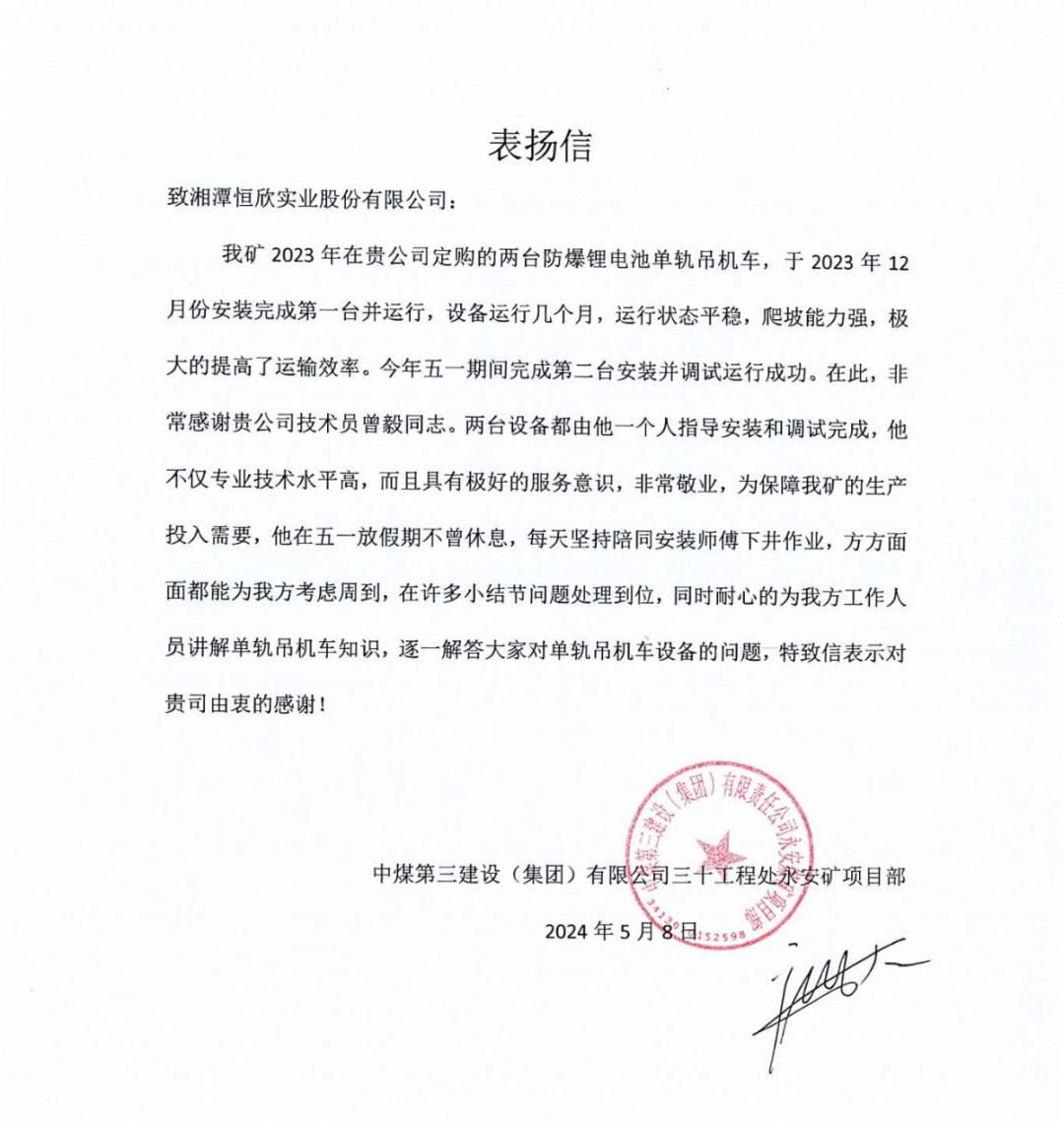 【恒欣股份】喜獲多封客戶含“贊”量頗高的表揚(yáng)信,生產(chǎn)的單軌吊產(chǎn)品性能和售后服務(wù)給予了高度評價(jià),肯定了單軌吊在煤礦井下運(yùn)輸效率高、爬坡能力強(qiáng),適應(yīng)性好、安全性能高、綠色環(huán)保等特點(diǎn)。同時(shí),客戶對售后服務(wù)團(tuán)隊(duì)的專業(yè)技能、快速響應(yīng)和敬業(yè)精神表示欽佩,對【恒欣股份】組織開展線上和線下的技術(shù)交流會表示非常的認(rèn)可,不僅提升了礦山企業(yè)對設(shè)備安全運(yùn)行的管理水平,還確保礦工的人身安全和設(shè)備的安全穩(wěn)定運(yùn)行。