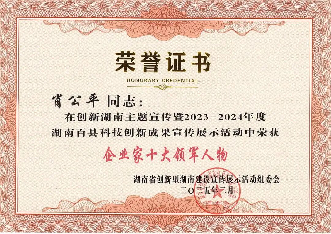 在“創(chuàng)新湖南主題宣傳暨2023-2024年度湖南百縣科技創(chuàng)新成果宣傳展示活動”中,【恒欣股份】董事長肖公平榮獲“企業(yè)家領(lǐng)軍人物”稱號。