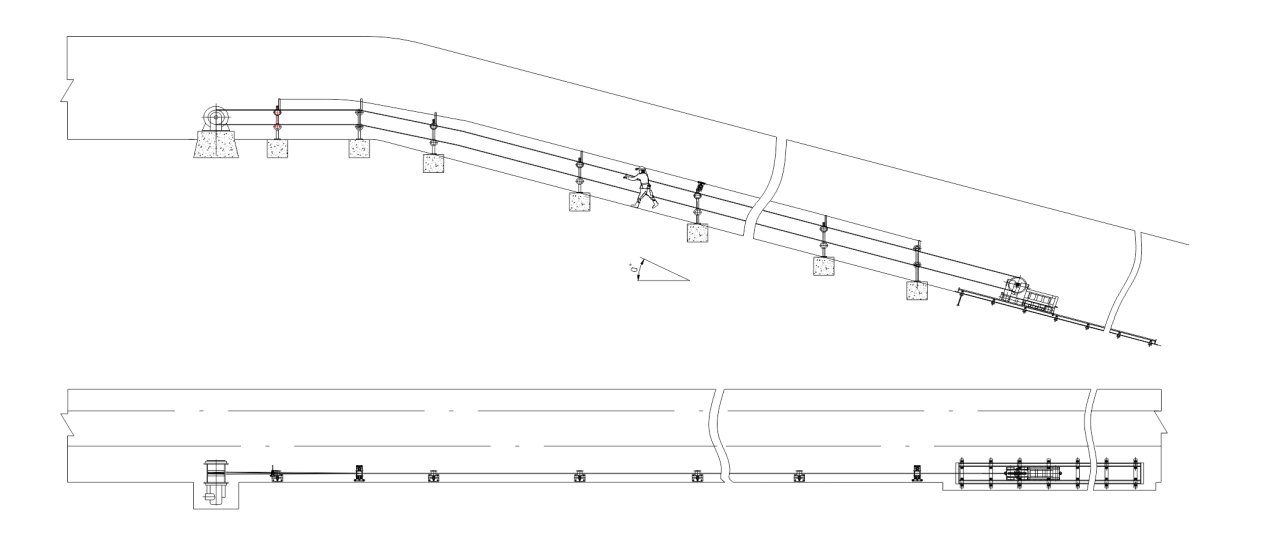 無極繩絞車帶動(dòng)鋼絲繩無極循環(huán)運(yùn)行,行人將卡繩棒卡住上山運(yùn)行的鋼絲繩,并由上山運(yùn)行的鋼絲繩將人拖動(dòng)向上助力上坡,從而減輕礦工斜井上坡時(shí)的體力消耗,但下坡時(shí)禁止使用助行器。