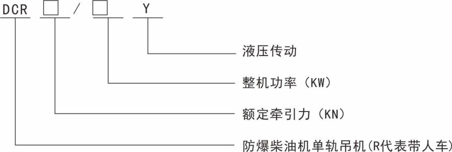 示列:型號(hào)DCR390/160Y,表示額定牽引力390KN,柴油機(jī)功率160KW,柴油機(jī)動(dòng)力液壓驅(qū)動(dòng)單軌吊機(jī)車。