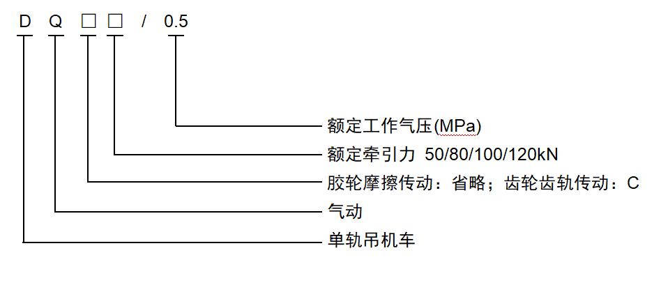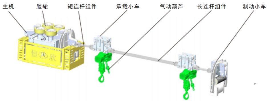 礦用氣動單軌吊機車主要由驅動裝置 、承載小車 、制動車 、氣動葫蘆 、拉桿 、氣動系統(tǒng) 、安全保護等組成 。 以壓縮空氣為動力源 ,驅動氣動馬達帶動膠輪或齒輪在軌道上運行 。適用于短程區(qū)間調度或掘進巷道的接力運輸;設備不產(chǎn)生廢氣 ,更適合通風條件差的工況 。通過操作手柄跟隨設備運行作業(yè) 。主要用于煤礦井下采掘工作面上下端頭巷道超前支護的物料 、設備的運輸 ,也可用于井下其它需要短距離運輸?shù)墓r。