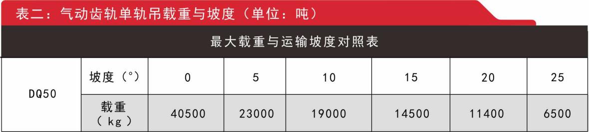 2.氣動齒軌單軌吊參數(shù)及負載表