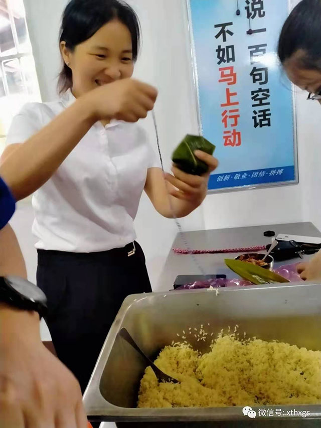 本次比賽共分為21組,每組4人,角逐"數量最多獎”和“最美粽子獎”。比賽前,進行了關于端午節(jié)相關知識及【中國銀行】和【湘潭恒欣】企業(yè)文化知識搶答。隨著【中國銀行】周行長吹響比賽口哨,活動氣氛高漲,平時在車間搬鐵動械、在家翹著二郎腿的大老爺們也開始像模像樣地“捉粽子”了;上得廳堂、下得廚房的女士們輕松地包了一個又一個有棱有角粽子。雖然比賽只有十分鐘,但速度可不慢,最快的一組共包了40多個粽子哦?!鞠嫣逗阈馈客聜冋f往年都是買粽子吃,今年可以吃到自己親手包的粽子,感覺特別好,特別幸福,印證了習大大的金句:“幸福是奮斗出來的”。